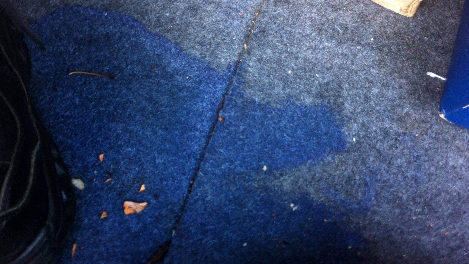 I'd forgotten to put the cap back on after taking some soap in to the school shower area. It seems on the short drive before I remembered the laundry soap had fallen over. Thankfully I didn't lose much, maybe 10-15% of the bottle, probably less than one wash's worth. But the interesting part is that the gray carpet in the trunk that it spilled on turned a bright blue. I have no idea why. It must have been some kind of chemical reaction. It was kind of cool.